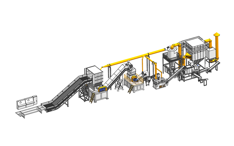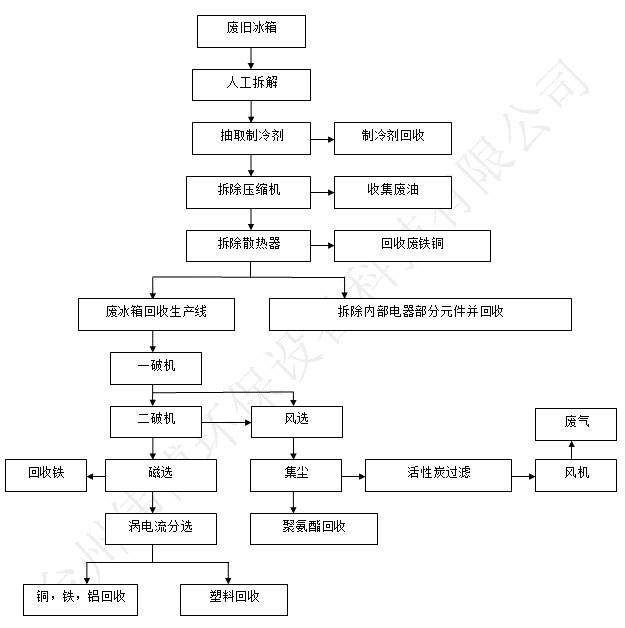该设备主要用于处理废旧冰箱,采用两级粉碎和两级分选将冰箱中的金属铜、金属铝、金属铁、塑料和聚氨脂分离开来,使其再生利用。